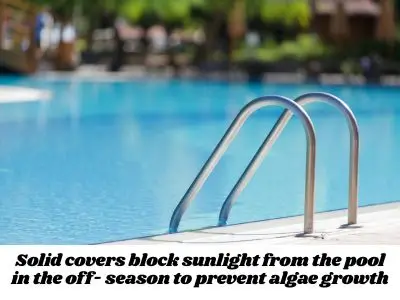 Solid Pool Covers keep out the most debris and sunlight, compared to other types of covers. Since they are not permeable, they prohibit debris from falling into your pool. They also completely block sunlight from hitting the water. By removing both, your pool water will look clean and clear the moment you remove your pool cover and the season starts!